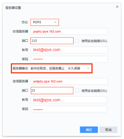 第三步:点击“服务器配置”,选择协议类型为POP。填写帐号和密码; 建议您使用SSL加密设置,更安全。 接收邮件服务器:pophz.qiye.163.com 勾选“SSL”时,端口号:995 发送邮件服务器:smtphz.qiye.163.com 勾选“SSL”时,端口号:994/465/587 请注意:在设置POP协议时会有在服务器保留周期的选项,建议选择“永久保留”,否则邮件会在一段时间后从服务器中删除。